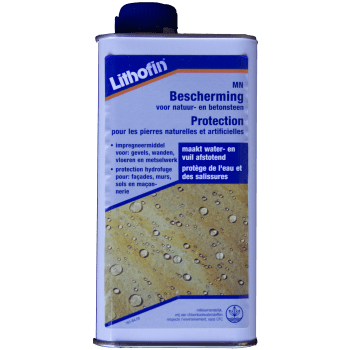 Lithofin Bescherming >W< – waterafstotend impregneermiddel voor steenLithofin Bescherming >W< is een watergedragen hydrofobeermiddel op basis van siliconaatverbindingen. Het product is oplosmiddelvrij, geurarm en universeel toepasbaar, geschikt voor zowel binnen- als buitengebruik. Het vormt een duurzame water- en vuilafstotende laag op minerale oppervlakken zonder het uiterlijk te veranderen.Belangrijkste eigenschappenRestvochttolerant en dringt goed door in poreuze oppervlakkenWater en schadelijke stoffen vormen parels op het oppervlakVermindert vuilophoping en vergemakkelijkt onderhoudWaterdampdoorlaatbaarheid blijft behoudenUV-bestendig en vergeelt nietVerkleuringen vrijwel uitgeslotenHoudbaarheid: ca. 5 jaar, afhankelijk van toepassing en belastingTechnische gegevensDichtheid: ca. 1,0 g/cm³pH-waarde: ca. 13Vlampunt: n.v.t.Uiterlijk: kleurloos, helderGeur: geen specifieke geurOplosbaarheid: in waterToepassingAbsorberende vloeren en gevels van natuursteen (graniet, kalksteen, zandsteen)Baksteen, klei- en klinkerplaten, betonsteen, gedeactiveerd betonBinnen- en buitenshuisAls voor-impregneermiddel bij het leggen van tuin- of terrastegelsLet op: niet geschikt voor gepolijste kalksteen, nieuw betonsteen of niet-absorberende oppervlakken. Voor vlekgevoelige vloeren wordt Lithofin VLEKSTOP >W< aanbevolen voor extra bescherming tegen water en olie.VerwerkingZorg dat de ondergrond absorberend, schoon en droog is.Gereedschap: kwast, roller, blokkwast of sproeier. Test eerst op een onopvallende plek.Breng het product gelijkmatig aan en laat het in de steen trekken.Grote oppervlakken stapsgewijs behandelen. Bij zeer zuigende ondergronden 2 keer nat-op-nat aanbrengen.Strepen en tranen uitsmeren en overtollig product na 10 minuten verwijderen.Bescherm het oppervlak 8 uur tegen water na behandeling.Drogingstijd: 30–60 minuten (bij 20°C). Het volledige effect ontstaat na 2–3 dagen.Rendement (afhankelijk van porositeit)Zandsteen gezaagd: ca. 3 m²/literKlinkers: 5–8 m²/literGraniet en betonsteen: 10–25 m²/literOpslagGoed afgesloten, koel en vorstvrij bewarenMaximaal 2 jaar houdbaarAangebroken verpakking altijd goed afsluiten en zo snel mogelijk gebruikenLithofin Bescherming >W< biedt een duurzame en effectieve bescherming voor alle absorberende steenoppervlakken, waardoor ze langer schoon, waterafstotend en onderhoudsvriendelijk blijven.