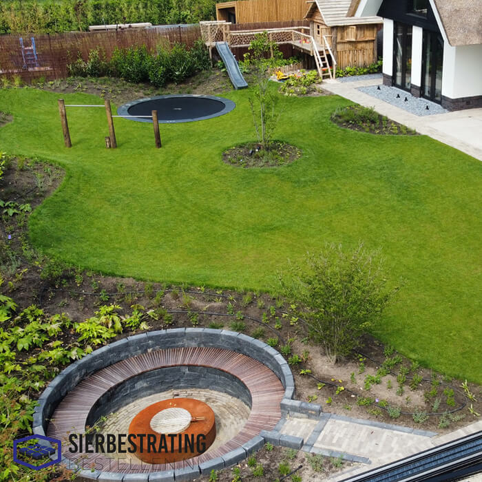 De klinkers en tegels sluiten naadloos aan bij de strakke architectuur van het huis, waardoor de tuin één geheel vormt met de woning – modern, warm en natuurlijk tegelijk.